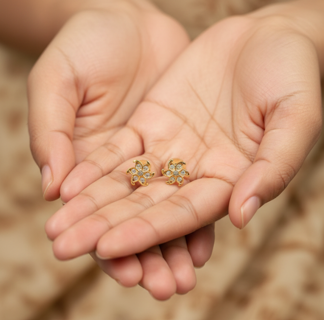 Shine with elegance in our Stellar Bloom Studs, a perfect fusion of floral charm and celestial sparkle. Designed with six delicately triangular petals, each set with dazzling American Diamonds (ADs), these earrings capture the brilliance of both a flower and a star.