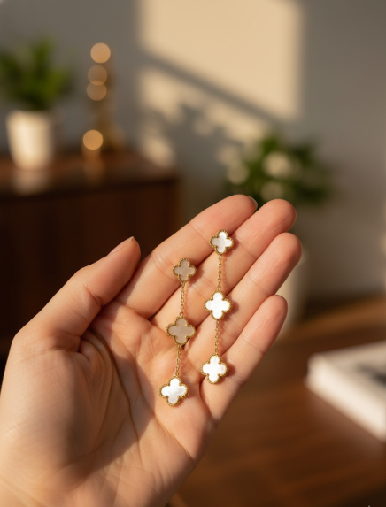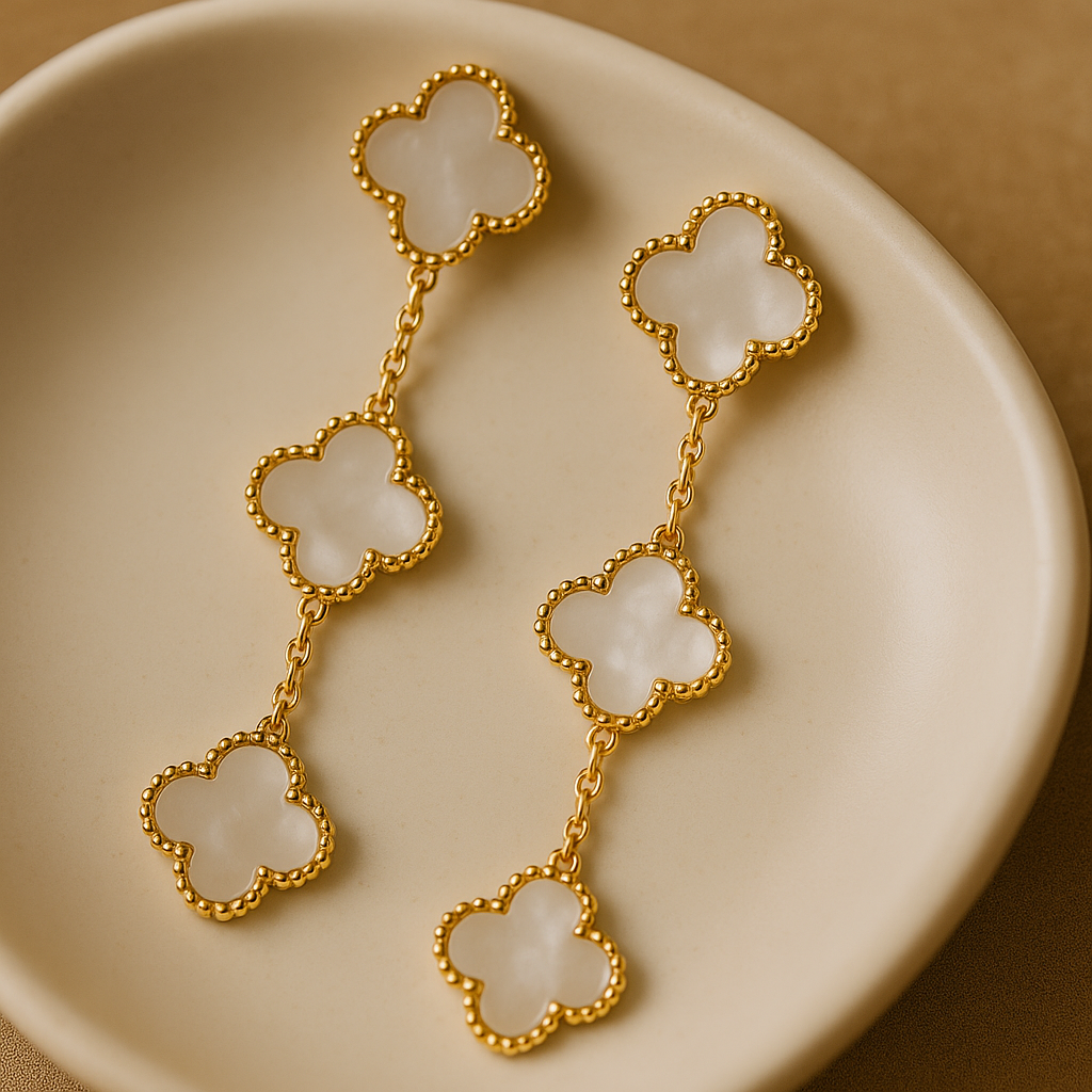 Elevate your elegance with the Eternal Clover Dangle Earrings from SperkyShine. Designed with delicate mother-of-pearl clover charms framed in lustrous gold plating, these earrings bring timeless sophistication to any look. Their graceful drop style adds just the right touch of movement and shine.