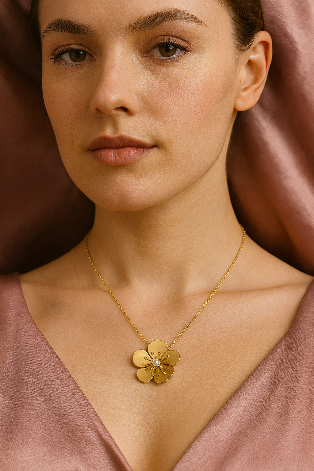 Embrace timeless charm with the Golden Bloom Pearl Necklace, featuring a beautifully sculpted metallic flower pendant adorned with a lustrous pearl at its center. The delicate petals reflect a radiant gold sheen, symbolizing elegance and sophistication. Suspended on a fine gold-plated chain, this necklace adds a graceful touch to any outfit—perfect for both everyday wear and special occasions. A true statement of refined femininity and classic luxury.