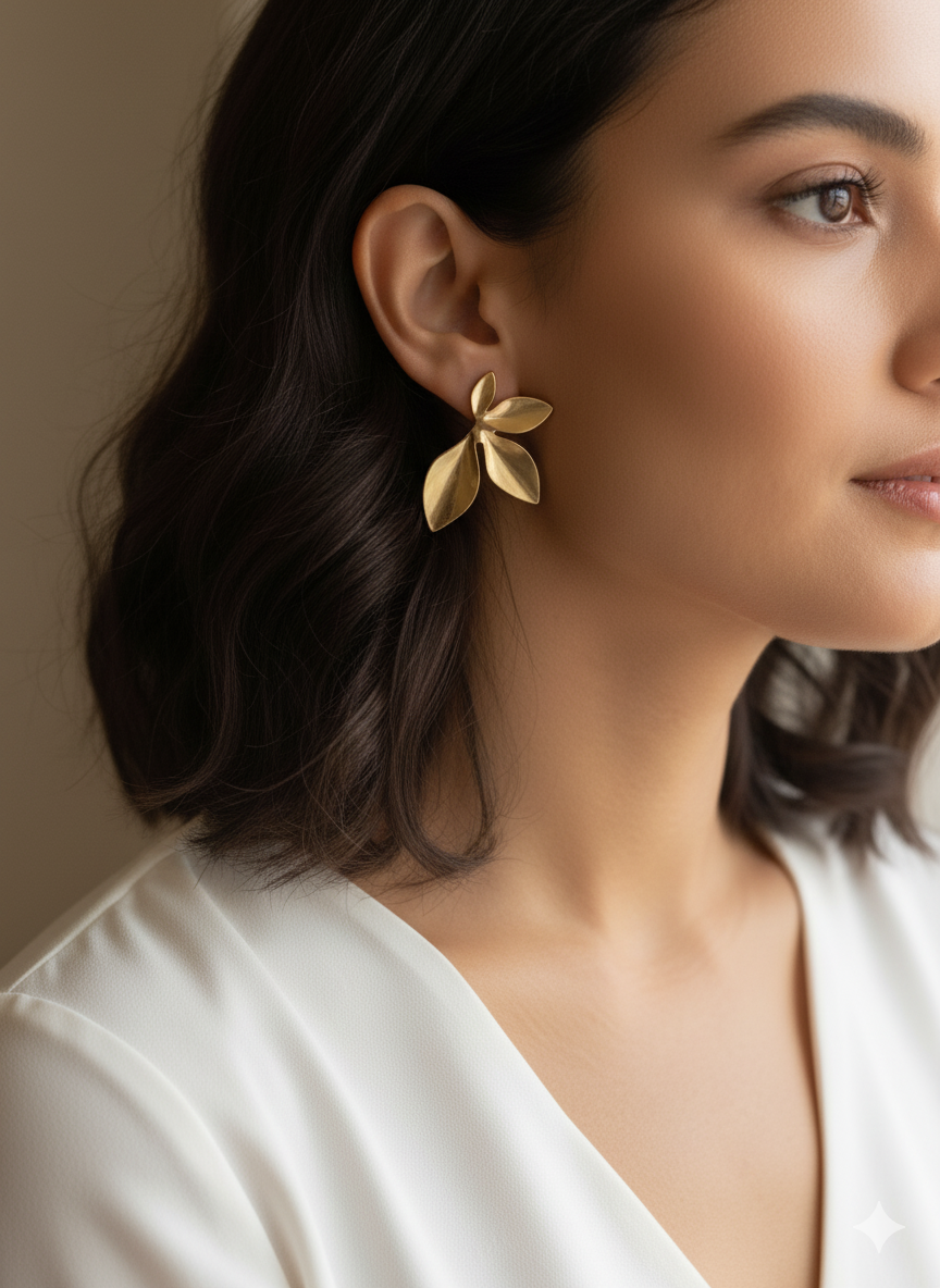 Grace your look with nature’s touch through the Golden Petal Bloom Earrings by SperkyShine. Designed in a modern floral silhouette, these matte-gold earrings embody elegance and femininity with a bold contemporary twist. Lightweight yet striking, they frame your face beautifully, perfect for elevating both casual and festive outfits. Crafted with a premium anti-tarnish finish, they retain their golden glow and charm wear after wear.