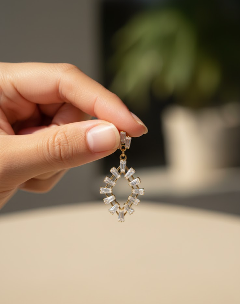 These Radiant Halo Drop Earrings feature a stunning geometric oval design encrusted with baguette-cut cubic zirconia, creating a sparkling halo effect that catches the light from every angle. Set in a sleek gold-tone base, these earrings blend timeless elegance with modern sophistication. Perfect for evening events, weddings, or elevating your everyday look, they are lightweight, durable, and crafted with an anti-tarnish finish to ensure lasting brilliance.